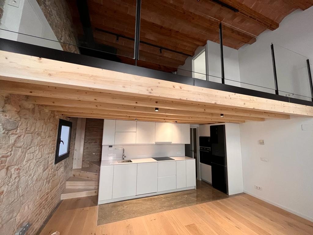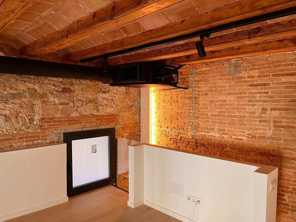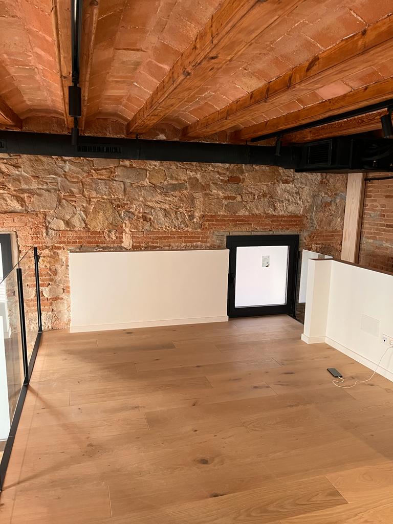 El loft ha sido completamente reformado, conservando diversos elementos originales, como los techos altos, las vigas de madera con bóveda catalana y las paredes de ladrillo visto. El parquet en los dos niveles aporta continuidad, calidez.